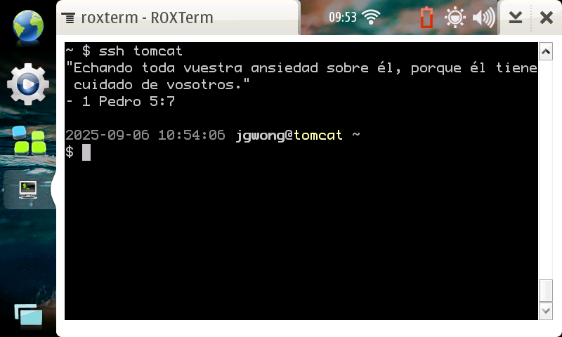 First, I tried generating the RSA key in Tomcat since it was awfully slow in Nyon, but for some reason, it didn’t work. Rather than figuring out why not, I generated it in Nyon again. I went to prepare some tea and, when I returned, it was finished. I copied it manually to ~/.ssh/authorized_keys